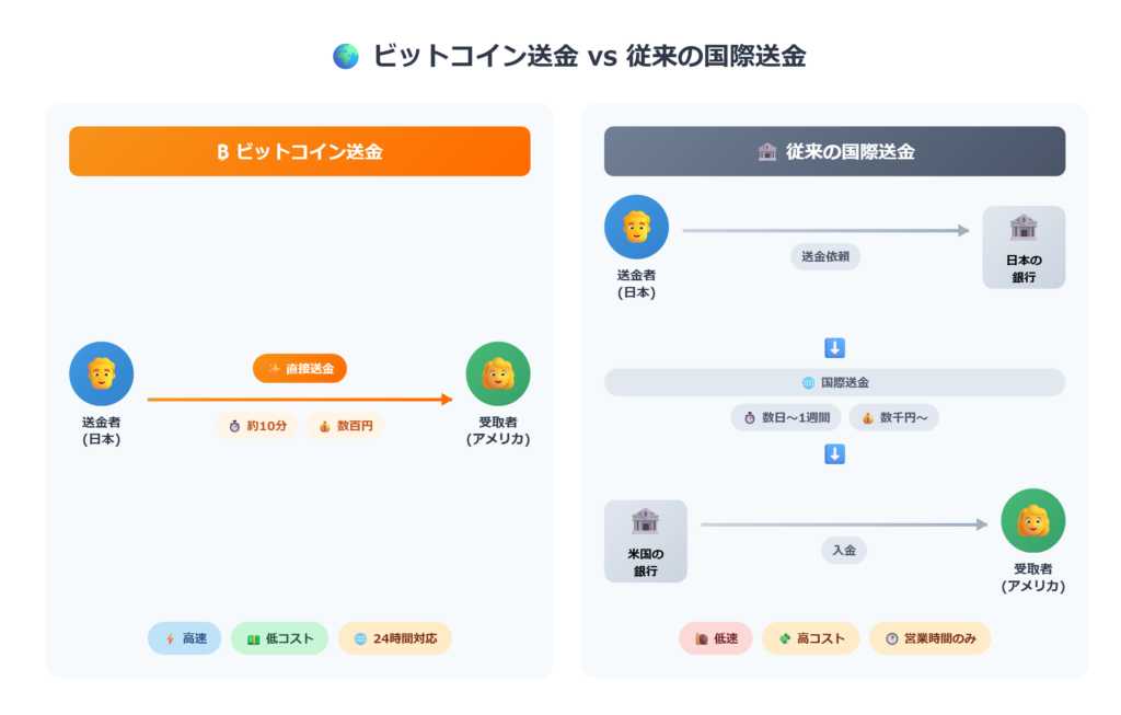ビットコインは、銀行口座を介さずにアドレス同士で直接送金ができ、24時間365日利用可能です。