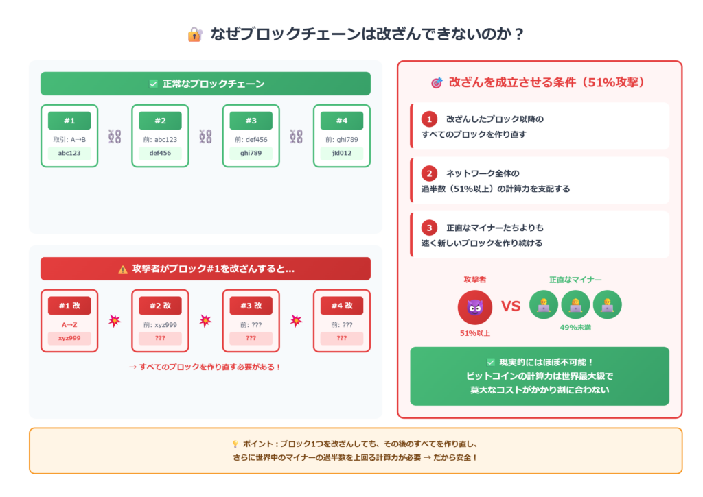 一部の参加者が不正なデータを書き込もうとしても、多数派の正当なチェーンが優先されるため、改ざんコストが極めて高くなる構造です。