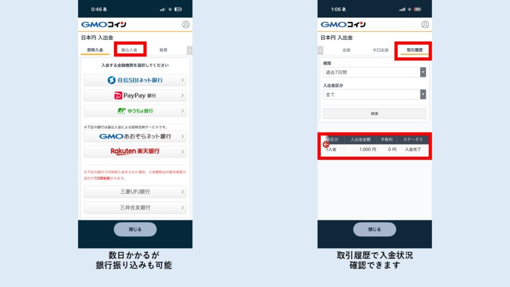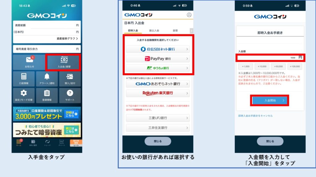あとは下の手順にそって日本円を入金するだけで、すぐに暗号資産の売買ができるようになります!