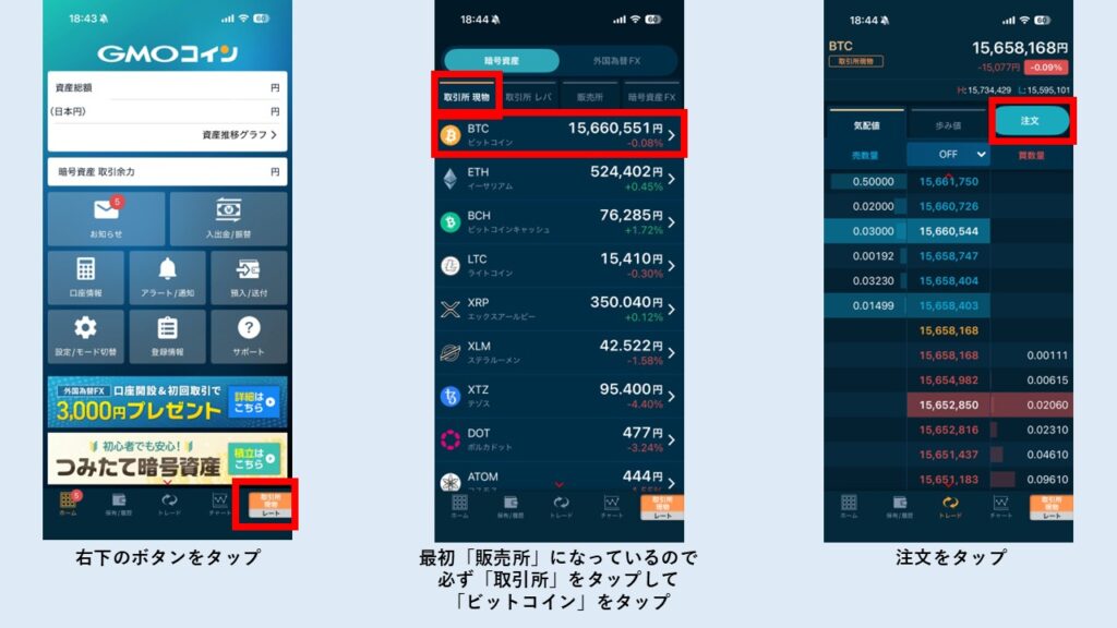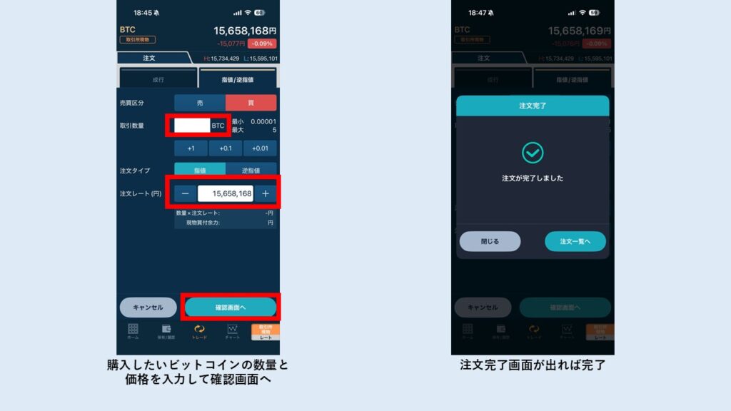 下の画像では取引所方式でビットコインの購入方法を解説しています。