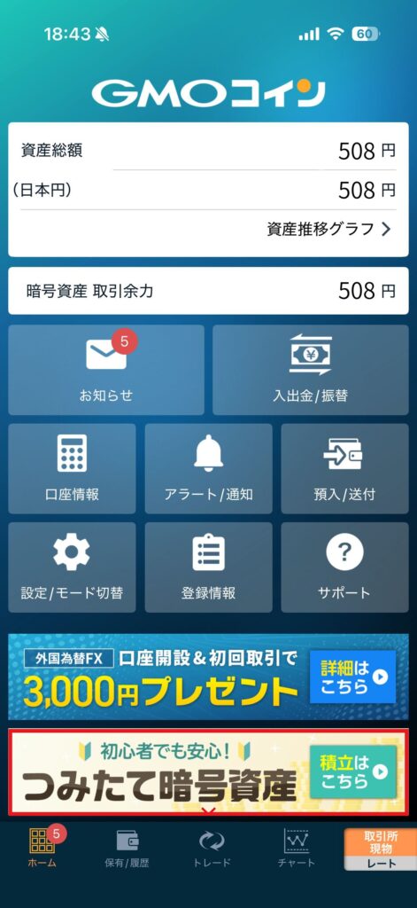 1,日本円の入金が完了したら、GMOコインのアプリを開き、「つみたて暗号資産」をタップしましょう。