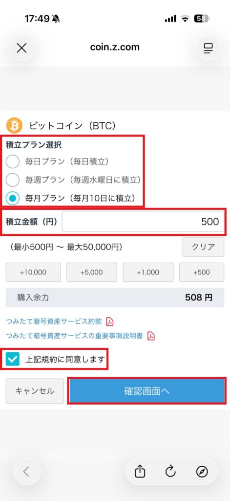 3,毎日/毎週/毎月の中からプランを選び、積立金額を入力しましょう。